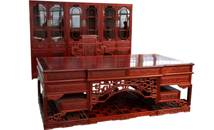 江蘇中尊木業(yè)有限公司書(shū)房系列產(chǎn)品:書(shū)房五件套草龍書(shū)柜、草龍大班枱、卷書(shū)寶座椅,洋花寫(xiě)字枱等。